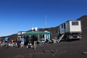 Schwärzer und schwärzer wird die Landschaft, durch die das Team der Helmholtz-Allianz ROBEX (Robotische Exploration unter Extrembedingungen) zu ihrem momentanen Arbeitsplatz fährt. Schließlich müssen alle am Rifugio Sapienza in Geländefahrzeuge umsteigen, um die letzten Höhenmeter zurückzulegen. Und dann taucht es mitten im Lavafeld auf - das Base-Camp, in dem seit anderthalb Wochen ein Lander, zwei Rover und mehrere Seismometer auf ihre "Mission" vorbereitet werden. Die Container sind den fast 50 Teammitgliedern von DLR, AWI, Uni Würzburg und TU Kaiserslautern für insgesamt vier Wochen Labor, Werkstatt und Büro zugleich.