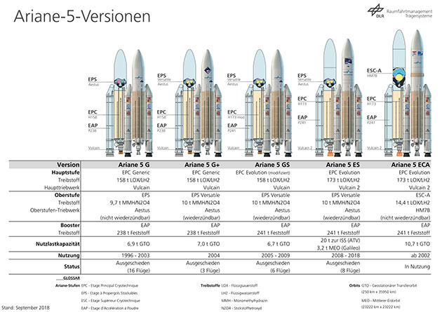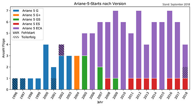 Ariane 5 wurde im Laufe der Jahre stetig weiterentwickelt und verbessert. Insgesamt gibt es fünf verschiedene Versionen. Ariane 5 G, G+, GS, ES und ECA, siehe Abbildung 1. Ariane 5 ES verwendet in ihrer Oberstufe das wiederzündbare Aestus-Triebwerk. Mit dieser Version wurden zum Beispiel alle ATVs und zwölf Galileo-Satelliten gestartet. Inzwischen ist nur noch die leistungsstärkste Variante ECA im Einsatz. Abbildung 2 zeigt eine Übersicht aller Starts der Ariane 5 nach Version.