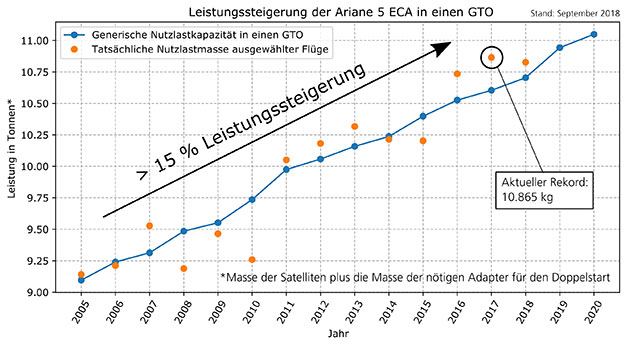 Alleine bei der ECA-Version beträgt die Leistungssteigerung über 15 Prozent seit 2005, siehe Abbildung 2. Die blaue Kurve in Abbildung 3 zeigt die sogenannte generische Leistung und die orangen Punkte markieren die tatsächlich erreichte Leistung ausgewählter Starts. Die generische Leistung ist quasi die Katalogleistung der Rakete. Durch cleveres Missionsdesign, Ausnutzen von Treibstoffreserven und Auswahl von Komponenten, die sich bei Tests als außerordentlich gut herausgestellt haben, war es bei vielen Missionen möglich, die Standardleistung zu übersteigen. Der aktuelle Rekord von 10,865 Tonnen wurde im letzten Jahr aufgestellt. Bis zum Ende ihrer Lebenszeit sind weitere Leistungssteigerungen fest eingeplant.