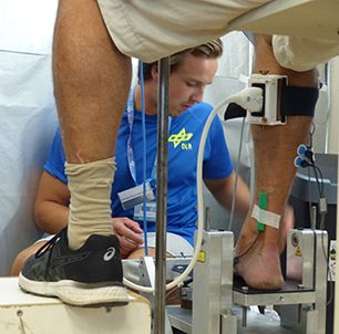 Zu Beginn des Versuchs wird erst einmal geschraubt. Bis alle Messpunkte auf den Probanden und sein Bein eingestellt sind, dauert es eine Weile und Sarah und Philipp verschwinden immer wieder in der Versenkung, um alles genau anzupassen. Und dann geht es los: Sie untersuchen, wie sich der Wadenmuskel unter Anspannung mechanisch verändert. Die beiden Untersuchungsleiter unterstützen die Probanden immer wieder kräftig verbal und sind regelmäßig erstaunt, wenn sie die Berichte der Probanden von ihren Wettkampfleistungen hören und wie sie hier an ihrer Station den Muskel spielen lassen.