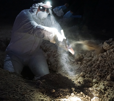 Nach der Auswahl der Grabungsstelle werden die Koordinaten überprüft und anschließend genau vermerkt, damit später eine exakte Zuordnung der Proben möglich ist. Nun wird der ausgewählte Ort begutachtet und Besonderheiten werden notiert (naher Bewuchs, Besonderheiten in der Bodenoberfläche etc.) und dann wird beprobt. Manchmal kann es durchaus zu Überraschungen am Standort kommen. Plötzlich gibt es beispielsweise eine kleine Minenstraße, die es via Satellit kurz vorher noch nicht gegeben hat. Oder es kommt zu sintflutartigen Regenfällen wie 2016, wodurch einige Gebiete entlang der Küste nicht befahrbar waren.