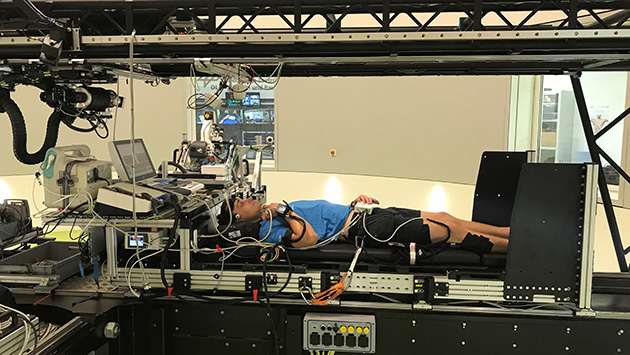 In unserem Teil der Studie wollen wir die Struktur und Funktion von Gehirn und Auge mit einer umfassenden Palette von Instrumenten messen, darunter MRT, Infrarotlicht, Ultraschall sowie ein automatisches Augenbewegungs-Tracking-System. Neu an dieser Studie ist der Einsatz der DLR-Zentrifuge zur Simulation der Erdgravitation. Wir untersuchen jedoch nicht nur den potenziellen Nutzen, sondern auch die negativen Auswirkungen. Beispielsweise analysieren wir mit dem Hirn-MRT und dem Augen-MRT die anatomische Ausgangsstruktur der Hirnkammern und des Auges sowie den Fluss von Rückenmarkflüssigkeit und des Blutes. Mit periodischen MRT-Untersuchungen stellen wir außerdem fest, ob pathologische Veränderungen durch die Kopf-Neigung auftreten und ob die Teilnehmer, die eine künstliche Schwerkraft-Zentrifugation erhalten, vor diesen Auswirkungen geschützt sind.