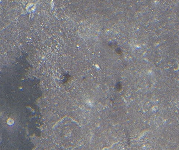 In diesem Gebiet südöstlich des prominenten Kopernikus-Kraters fallen in der Vollmondansicht viele kleine dunkle Pünktchen auf. Zuerst denkt man an Bildfehler, verursacht etwa durch Staub auf dem Sensor. Tatsächlich sind die Fleckchen aber real. Gesteinsbrocken haben hier beim Einschlag auf der Mondoberfläche die hellere Deckschicht durchdrungen und dunkleres Material aus der Tiefe nach oben befördert. In der unteren Aufnahme derselben Region kurz vor Sonnenuntergang fallen diese Stellen kaum auf.