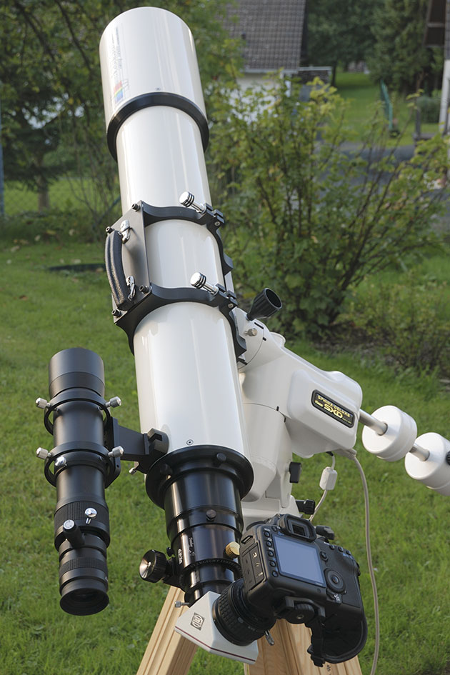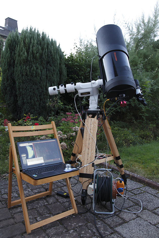 Die kleine rote Kamera hinten am Teleskop ist mit dem Computer links verbunden. Dieser steuert Teleskop und Kamera vollautomatisch mit meiner Open-Source-Software MoonPanoramaMaker und nimmt die Daten auf. Für das superscharfe Schwarzweißpanorama kamen so in über zwei Stunden 600 Gigabytes zusammen.