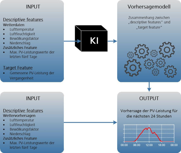 Aus den historischen Wetterdaten, den berechneten Werten des zusätzlichen Parameters und den historischen PV-Leistungsmesswerten wurde ein Trainingsdatensatz erstellt. Dieser wurde verwendet, um das Vorhersagemodell zu trainieren. Dabei versucht die KI einen Zusammenhang zwischen "descriptive features" und "target feature" zu erlernen und möglichst auch auf neue Situationen anzuwenden. In weiteren Schritten verwendet das Modell diese Zusammenhänge, um eine PV-Leistungskurve für die nächsten 24 Stunden auf Basis der vorhandenen Wetterprognose zu erstellen. Diese prognostizierte PV-Leistungskurve ist der Output und somit das Ergebnis des gesamten Vorhersageprozesses.