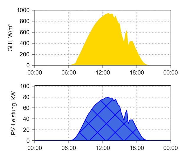 Oben haben wir beschrieben, dass alle KNN Eingangsinformationen, also "Futter", brauchen, um die zu bearbeiten und ein Ergebnis zu liefern – in unserem Fall ist das Ergebnis die Vorhersage der PV-Leistung für die nächsten 24 Stunden. Die Eingangsinformationen für unser Vorhersagemodell sind die frei verfügbaren Wetterdaten, welche Lufttemperatur, Luftfeuchtigkeit, Bewölkungsfaktor und Niederschlag einschließen. Diese beinhalten jedoch keine Globalstrahlungswerte. Deswegen haben wir entschieden, ein zusätzliches Input-Feature aus den vorhandenen gemessenen Leistungswerten der PV-Anlage zu generieren. Die PV-Leistungswerte sind direkt von der Solarstrahlung, die auf die PV-Module fällt, abhängig. Dieser direkte Zusammenhang zwischen der Solarstrahlung, beziehungsweise GHI, und der PV-Leistung ist auf dem unteren Bild deutlich zu sehen. Auf den ersten Blick erkennt man, dass sich die Leistung der PV-Anlage (blauer Bereich unten) erhöht, wenn die Solarstrahlung (gelber Bereich oben) steigt und mit dem Sonnenuntergang auch die PV-Leistung wieder sinkt.