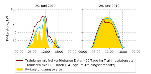 Unsere Ergebnisse zeigten, dass wir viel mehr frei verfügbare Wetterdaten zum Trainieren benötigen, also mehr Tage in die Vergangenheit gehen müssen, im Vergleich zu den GHI-Daten, um das bestmögliche Ergebnis zu erhalten. Obwohl die verwendeten frei verfügbaren Wetterdaten keine Solarstrahlungswerte enthalten und das von uns entwickelte Vorhersageverfahren keine technischen Informationen über die PV-Anlage erhält, kann es trotzdem aussagekräftige Prognosen der PV-Leistung für die nächsten 24 Stunden erstellen, wie in diesem Beispiel der Abfall der PV-Leistung am Nachmittag des 20. Juni 2019 vorhergesagt wurde.