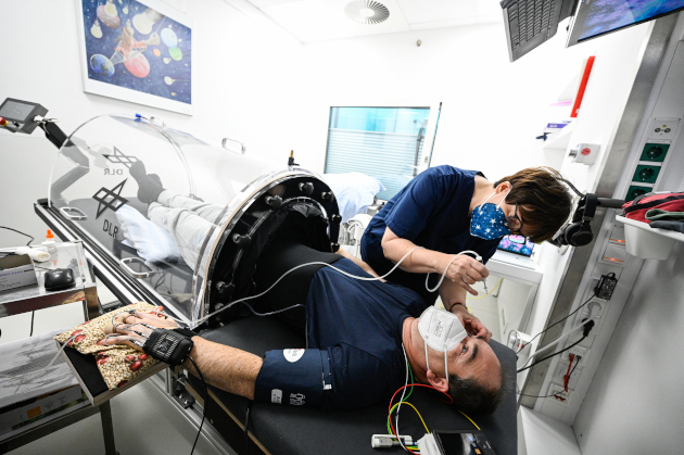 Die Wirksamkeit wird durch Tests bewertet, etwa zur Herz-Kreislauf-Funktion, zu Gleichgewicht, Muskelkraft – und natürlich zum Sehen. Die anderen sechs Personen aus der Kontrollgruppe sitzen zweimal am Tag für drei Stunden aufrecht auf einem Stuhl. Die Teilnehmerinnen und Teilnehmer der zweiten Kampagne, die Ende Januar 2022 startet, werden wieder mit der LBNP arbeiten. In der dritten und vierten Kampagne werden spezielle Oberschenkel-Manschetten in Verbindung mit einem Radfahr-Training eingesetzt.