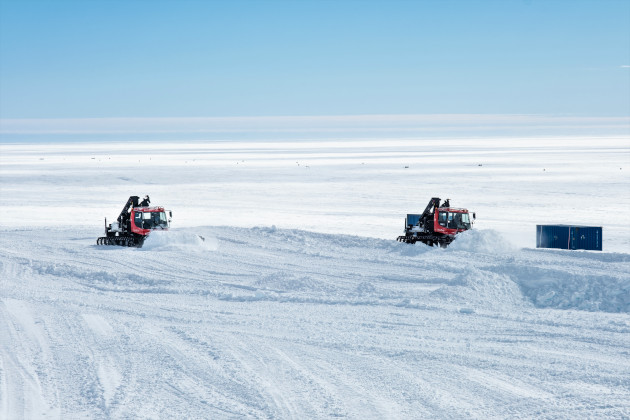 Jeder weitere Transport findet jedoch auf dem Eis statt. Schneemobile sind für kürzere Fahrten ohne schwere Last geeignet, während PistenBully-Raupenfahrzeuge Schwersteinsätze wie Schleppen und Schneeschieben bewältigen können und bei längeren Fahrten zum Einsatz kommen.