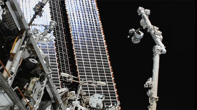 Matthias kam dabei die Aufgabe zu, Tom Marshburn, den mit roten Streifen auf seinem Raumanzug gekennzeichneten "EV1", mit dem SSRMS (Space Station Remote Manipulator System - dem Roboterarm der ISS) vom defekten SASA zum ELC-3 (Express Logistics Carrier) ganz außen auf dem Querträger (P3) und zurück zu schwenken, wo bereits seit 2011 ein Ersatz-SASA als ORU (Orbital Replacement Unit - austauschbares Ersatzgerät) vorgehalten wird.