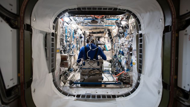 Und am Mittwoch eben nun ein größeres und aufwändigeres Experiment: "Metabolic Space". Matthias legte ein portables Gerät an, das den Sauerstoff- und Kohlendioxidgehalt seiner Ein- und Ausatemluft misst, dazu einen Körpertemperaturmesser und ein Pulsmessgerät. So "instrumentiert" hat er dann seinen täglichen Sport verrichtet und dann die gemessenen Werte an uns übertragen. Über drei Sessions - jetzt, in der Mitte seiner Mission und ganz am Ende - erhofft man sich Aufschlüsse über den Zustand seines Herz-Lungen-Systems und hofft vor allem, ein geeignetes Gerät für derartige Untersuchungen für zukünftige Missionen zu entwickeln.