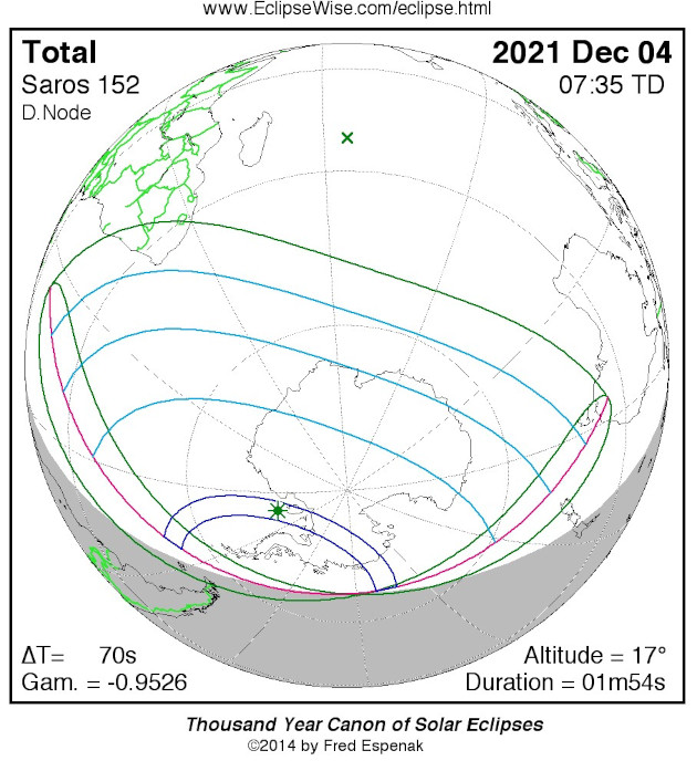 Die jetzige Sonnenfinsternis gehört zum 152. Saroszyklus, jenem bewährten Zeitmaß für Finsternisse, welches auf die Babylonier zurückgeht. Nach 6.585 ⅓ Tagen, so stellten sie fest, nehmen Mond, Erde und Sonne nahezu wieder die gleiche Stellung zueinander ein, sodass sich Sonnen- und Mondfinsternisse unter fast denselben himmelsmechanischen Randbedingungen wie 18 Jahre zuvor wiederholen. Saros 152 enthält insgesamt 70 Finsternisse, 30 davon verlaufen total, 22 ringförmig und 15 partiell; drei folgen einer ringförmig-totalen (hybriden) Form. Mit 5 Minuten und 16 Sekunden wird am 9. Juni 2328 die längste Totalität in diesem 1.244 Jahre lang währenden Finsterniszyklus erreicht. Die Finsternis am 4. Dezember 2021 ist seit dem 26. Juli 1805, dem Beginn des solaren Saros 152, die dreizehnte. Imposante Eindrücke von der letzten antarktischen S 152-Sonnenfinsternis, der zwölften, lassen sich unter anderem hier finden.