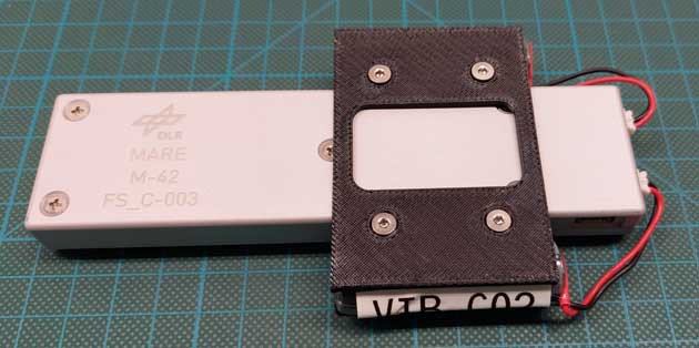 Ein Teil des MARE-Experiments sind die 16 Strahlungsmessgeräte mit dem Namen M-42, die unsere Arbeitsgruppe Biophysik der Abteilung Strahlenbiologie am DLR-Institut für Luft- und Raumfahrtmedizin entwickelt, getestet und jetzt auch final für die NASA-Mission Artemis-1 gebaut hat. M-42 ist ein aktives Strahlungsmessgerät. Es braucht also Strom, um den Strahlungsdetektor (eine kleine Si-Diode) und die dazugehörige Mess-Elektronik zu versorgen, um die dabei generierten Messdaten abzuspeichern. Die Stromzufuhr kann entweder direkt über ein USB-Kabel oder über Batterien erfolgen, die einfach an zwei Anschlüssen in unser M-42 eingestöpselt werden.