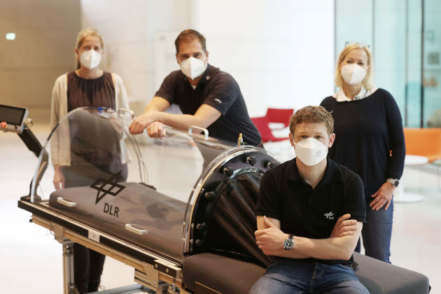 Stefan Möstl vom DLR-Institut für Luft- und Raumfahrtmedizin ist stellvertretender Projektleiter der Studie und darüber hinaus zuständig für die LBNP-Gegenmaßnahme: „Das Prinzip und die Kammern selbst wurden von einem Team verschiedener DLR-Institute und -Abteilungen entwickelt, das konnten wir nicht alles selber machen. Jörg Drescher vom Institut für Materialphysik im Weltraum hat die Unterdruckkammern konstruiert. Christian Baßler vom Systemhaus Technik West hat die Integrierung der Neopren-Abdichtung entwickelt. Aus dem Institut für Luft- und Raumfahrtmedizin haben Simon Jokisch, Hartmut Friedrich und Christoph Steger dann den Prototypen und die sechs finalen Kammern zusammengebaut. Gernot Plath und sein Sohn Sven Plath haben die Druckregelung und die zentrale Überwachung der Kammern entwickelt und gebaut. Das gesamte LBNP-System wurde dann von Wolfgang Doering und Stefan Schmitt in die Probandenstation integriert. Das war wirklich toll, mit so vielen Kolleginnen und Kollegen aus mehreren DLR-Bereichen zusammenzuarbeiten, mit dem gemeinsamen Ziel, eine Gegenmaßnahme zu realisieren, welche möglicherweise in naher Zukunft auf der Raumstation verwendet wird.“ Diese Perspektive motivierte nicht nur das DLR-Team. Auch viele der Probandinnen und Probanden geben diesen Aspekt als treibende Kraft an.