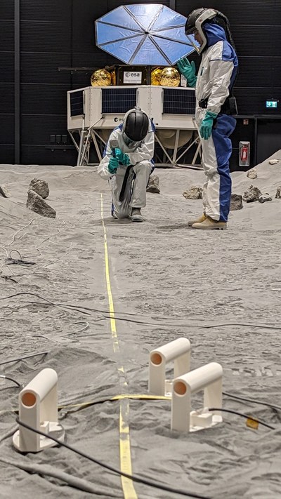 Zunächst sind das ISAE-SUPAERO-Institut, eine französische Forschungsorganisation, und das Geoforschungszentrum (GFZ) Potsdam unserem Regolith-Testbett mit Geophonen und Seismometer zu Leibe gerückt. Im Zusammenspiel mit unserem LUNA-Seismometer und der verlegten Glasfasertechnik haben sie simuliert, wie die „irdischen“ Messinstrumente auf einer „lunaren“ Oberfläche funktionieren und wie sich die Messungen optimieren lassen.