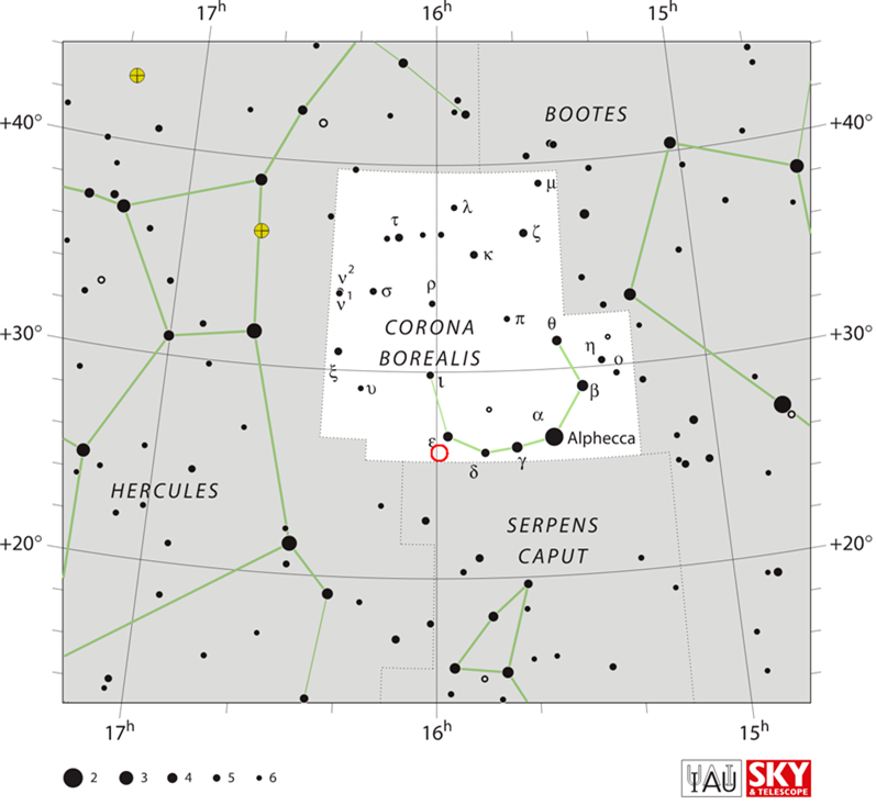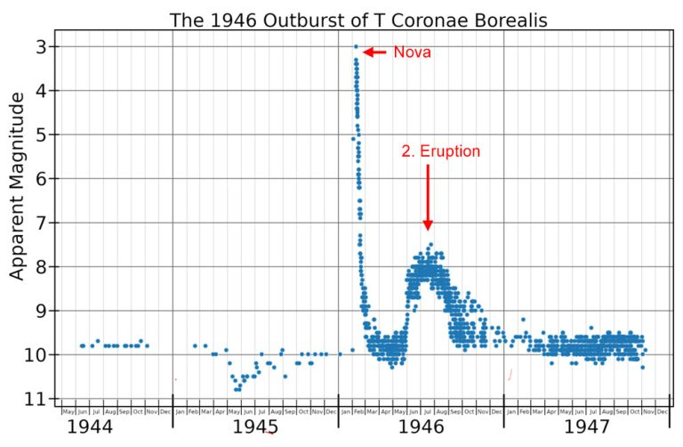 Wird T Cornae Borealis schon in den nächsten Tagen und Wochen aufleuchten und dadurch quasi zu einem seltenen Weihnachtsstern werden? Unwahrscheinlich wäre eine solche „astronomische Sternstunde“ nicht und für viele Zeitgenossen bestimmt eine Überraschung, die sich in Windeseile spektakulär in den Medien verbreiten würde. Als Amateurastronom kann man auch einen wissenschaftlich wertvollen Beitrag liefern, selbst wenn man nur mit einem Fernglas den Helligkeitsverlauf verfolgt und dokumentiert. Denn es kommt während der relativ kurzen Zeitspanne des Helligkeitsanstiegs und -abfalls der Nova darauf an, möglichst lückenlos spektroskopische und photometrische Messdaten über alle Wellenlängenbereiche hinweg zu sammeln. Großen bodengebundenen Observatorien steht dafür mitunter nicht genügend Zeit zur Verfügung, das plötzliche Aufleuchten einer Nova in allen Phasen durchweg beobachten zu können. Oder sie befinden sich geographisch in einer Gegend, von der aus das Ereignis nicht verfolgt werden kann. Es ist jedoch vorgesehen, dass Weltraumteleskope wie Hubble, James Webb, Integral und das Neil Gehrels Swift Observatory sofort ihre Beobachtungen aufnehmen, wenn ein Ausbruch von T Coronae Borealis bestätigt ist. Der Fermi-Satellit der NASA zur Detektion energiereicher Gammastrahlen überwacht schon heute täglich den Stern.