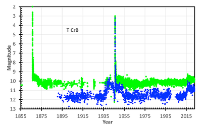Bis heute sind vier Nova-Ausbrüche von T Coronae Borealis verbürgt: einer im Herbst des Jahres 1217, als man ein „erstaunliches Zeichen“ am Himmel sah, ein weiterer Ende Dezember 1787 und die beiden letzten aufeinanderfolgenden vom 12. Mai 1866 und 9. Februar 1946, die intensiv beobachtet und studiert wurden. Normalerweise liegt die visuelle Helligkeit von T Coronae Borealis zwischen der zehnten und elften Größenklasse. In der Novaphase kann das Sternsystem jedoch so hell wie der Polarstern werden.