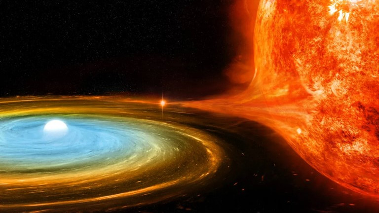 Beide Sterne umlaufen sich, 3.000 Lichtjahre von uns entfernt, in rund 228 Tagen. Vom Roten Riesen, der mit seiner Größe annähernd die Bahn des Planeten Merkur ausfüllen würde, strömt wasserstoffreiche Materie über einen kräftefreien Gleichgewichtspunkt in Richtung Weißer Zwerg. Sie formt sich um den kleinen, kompakten Stern unter Einfluss der Corioliskraft zu einer spiralförmig rotierenden Akkretionsscheibe, von der regelmäßig Materie zur heißen Oberfläche des kompakten Zwergsterns stürzt und um ihn herum eine flache, dichte Wasserstoffatmosphäre entstehen lässt. Der sukzessive Aufprall heizt zunehmend die Wasserstoffatmosphäre durch Umwandlung von kinetischer Energie in Wärme auf. Beim Erreichen einer kritischen Temperatur von einigen Millionen Grad setzen an der Oberfläche des Weißen Zwergs thermonukleare Reaktionen ein, die ein explosionsartiges Abstoßen der dichten Atmosphäre bewirken. Die heftige und zugleich kühlende Expansion der abgestoßenen Materie lässt den Weißen Zwerg optisch als Nova aufflammen.