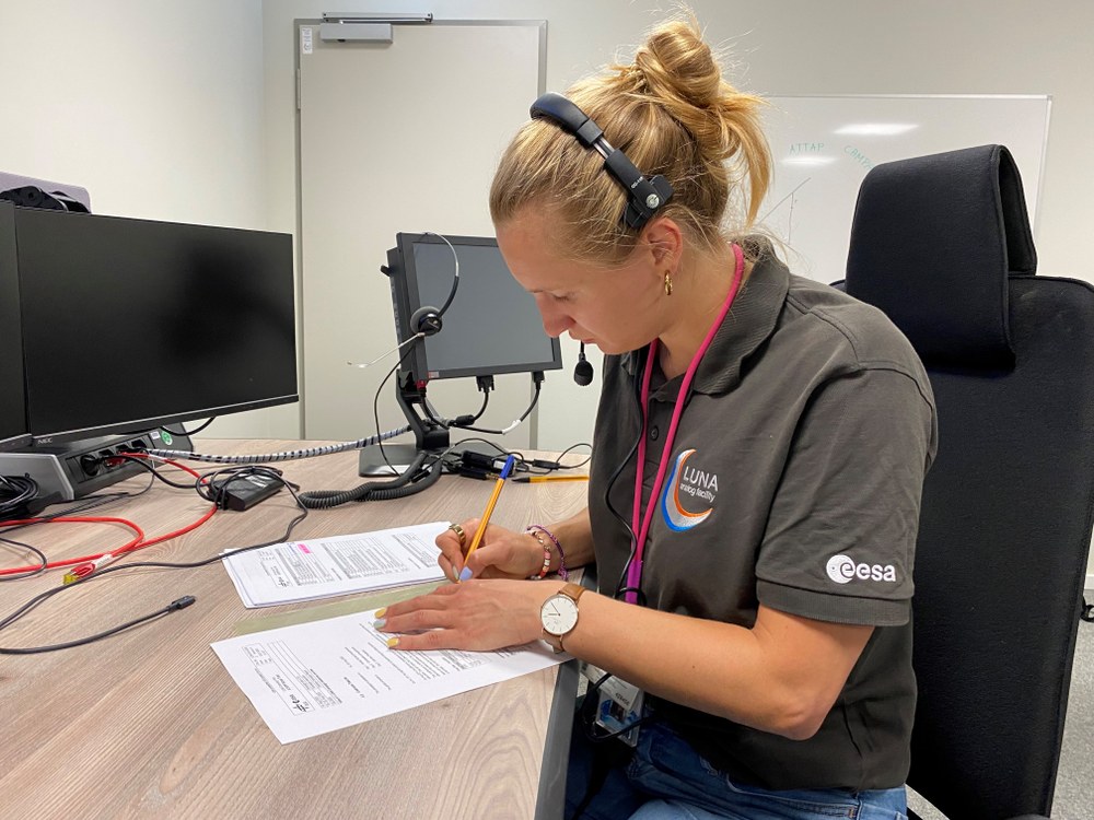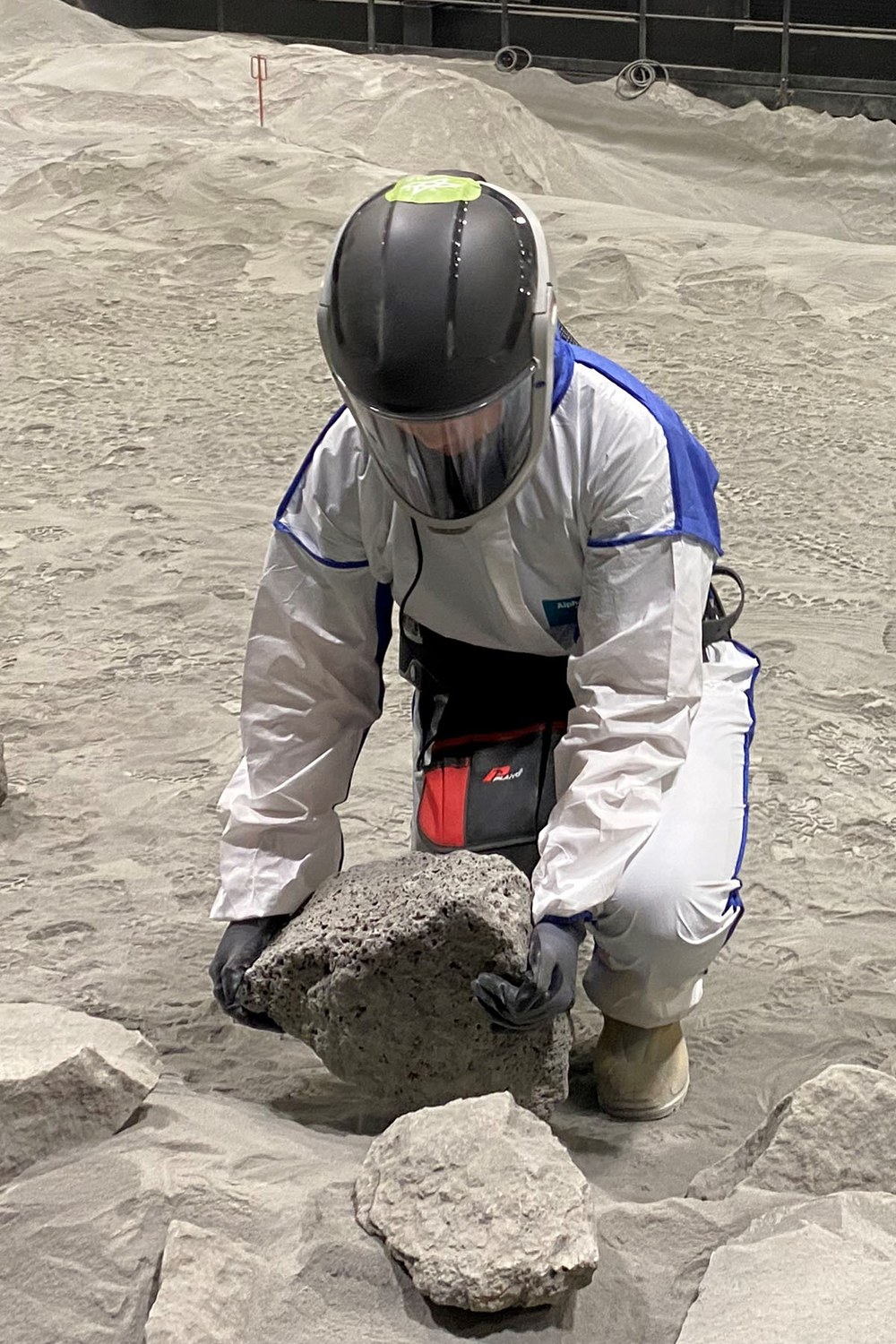 Der makellose, unberührte Mondboden in der Halle ist mittlerweile von den vielen Spuren des Rovers gekennzeichnet. Die Studierenden wollen mit der Kampagne zum ersten Mal testen, wie sich der Rover bei unterschiedlichen Geschwindigkeiten und unterschiedlichen Festigkeiten des Untergrunds verhält. An einem Hügel gibt der Rover zwar alles – aber immer wieder graben sich die Räder in den rutschigen Regolith ein. Auf Fotos sieht die Szene schon fast mondähnlich aus, wenn man die Außenwand der Halle ignoriert: Eine Crew in Ganzkörperanzügen steht zwischen den grauen Gesteinsbrocken, Licht spiegelt sich in ihren Gesichtsvisieren, im Hintergrund ragen die Beine eines Landers in den grauen Staub. Maria steht am Rand, behält alles im Auge. Über ihren Kopfhörer sind die Funksprüche des Teams zu hören, die mit ihren Kolleginnen und Kollegen im Kontrollraum im ersten Stockwerk kommunizieren. Im Idealfall muss sie in diesen Momenten gar nichts machen, weil sie bei den Vorbereitungen alle Fragen, Details und Rahmenbedingungen geklärt und im Kampagnenplan festgehalten hat.