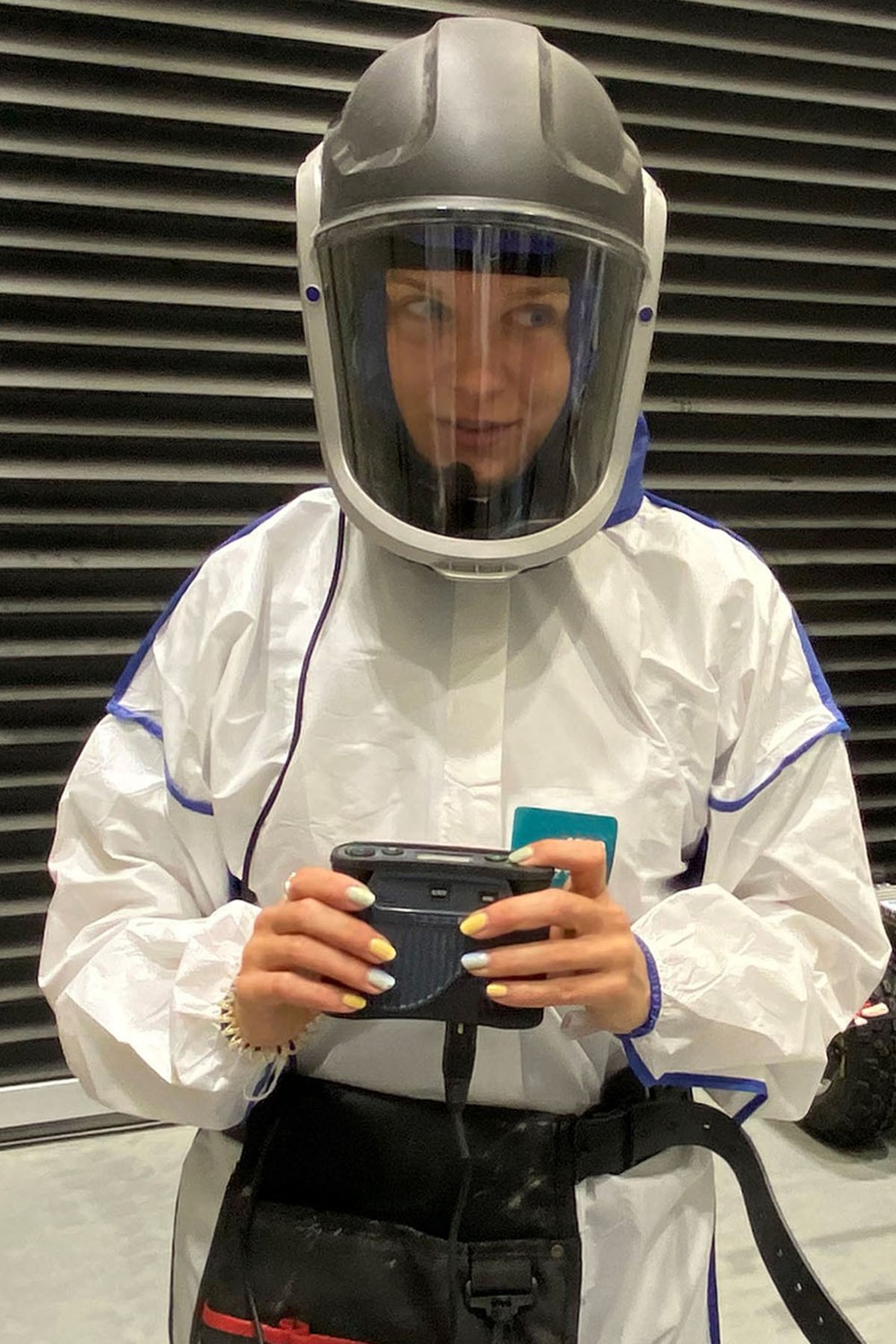 Während einer Test-Kampagne in der LUNA-Halle ist Maria immer vor Ort, meistens sind das mehrere Tage im Monat. Dann achtet sie darauf, dass an den Roverreifen kein Schmutz von Fahrten im Außengelände klebt. Dass alle, die in die Halle gehen, ihre Ausrüstung von Gesichtsmaske, Ventilationsmotor über den Anzug bis hin zu den Stiefeln korrekt anlegen. Dass alle Funkgeräte funktionieren und die Kommunikation untereinander und mit dem Team im Kontrollraum problemlos läuft. Soll auch das Licht in der Halle wie auf dem Mond schräg und grell einfallen, muss der Sonnensimulator vorbereitet werden. Werden schwere Gegenstände bei Experimenten oder bei der Vorbereitung der Halle bewegt, kann die Ingenieurin den Kran bedienen, der unter dem Dach verläuft. Soll der Regolithboden zum Beispiel aufgefüllt oder verdichtet werden, wird’s praktisch – dann kommen ganz irdische Werkzeuge wie Rechen oder Schaufel zum Einsatz, und die Teams treten den Boden mit ihren Stiefeln fest.