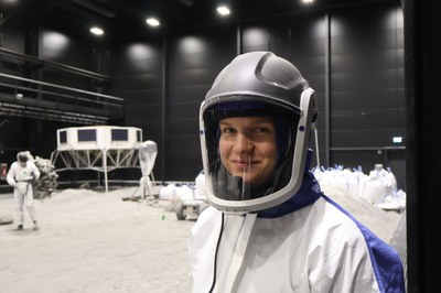 Langsam gleitet das Rolltor nach oben. Nur ein paar Meter und dann beginnt die Mondlandschaft. Grauer Regolith, vereinzelte Felsen, weiter hinten steht das Landegerät. Maria Hallinger betritt die Halle. In ihre Gesichtsmaske strömt Luft, die ein Motor stetig ventiliert. Ein Ganzkörperanzug, hohe Gummistiefel und Handschuhe schützen ihren Körper vor der feindlichen Umgebung mit spitzen Staubpartikeln, die in die Lunge geatmet werden oder sich auf der Haut ablagern könnten. Und sie schützen die Umgebung vor allem, was die Ingenieurin in das Testfeld einschleppen könnte. Straßendreck, Hautschuppen, kleine Kleidungspartikel. Maria gehört zum Team, das sich um den Test-Kampagnenbetrieb der LUNA-Halle von DLR/ESA in Köln kümmert. Heute ist sie Kampagnenleiterin und betreut ein Studierenden-Team, das einen Rover unter mondähnlichen Bedingungen testen will.