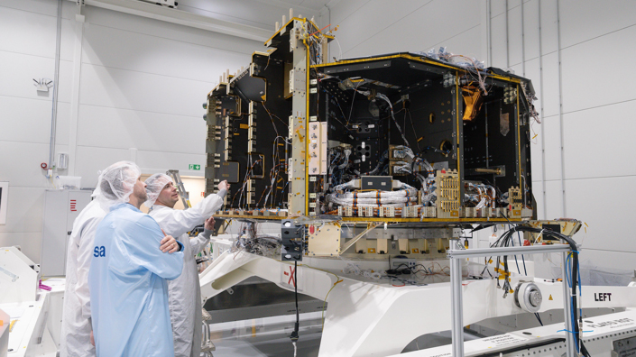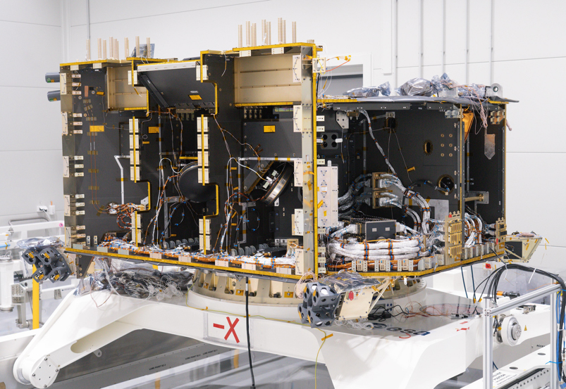 Parallel zu den Arbeiten an der optischen Bank bauen die Ingenieure von OHB das Servicemodul von PLATO zusammen. Dieser Teil des Raumfahrzeugs enthält Computer für den Betrieb der Kameraelektronik und anderer wichtiger Komponenten des Raumfahrzeugs. Dies schließt die Subsysteme für die Steuerung von Ausrichtung und Orbitalbewegung, für den Antrieb, die Energieverteilung, die Kommunikation und die Datenübertragung mit ein.