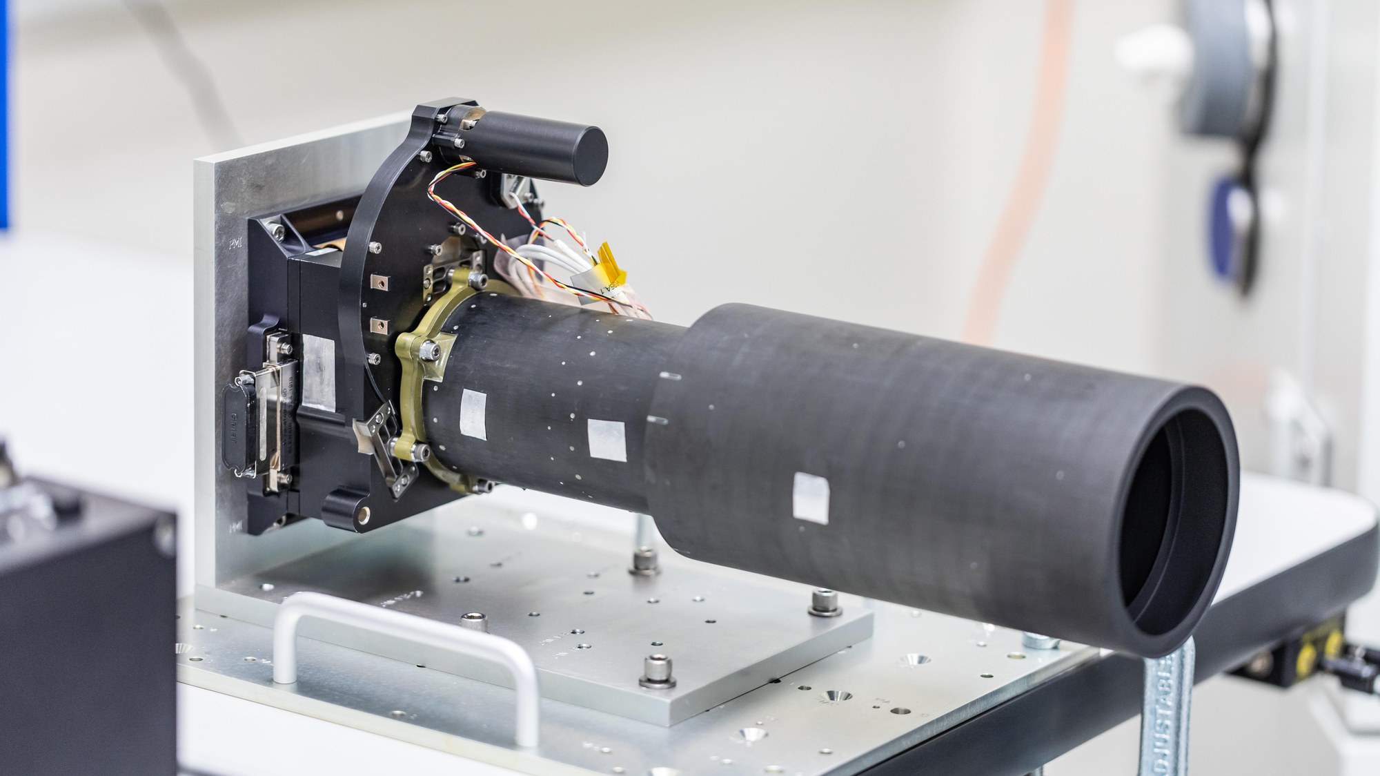 Sieht anders aus als unsere Handy-Kameras, ist aber eben auch eine wissenschaftliche Kamera: Einer der beiden baugleichen „Imager“, der seit Jahrzehnten großartige Aufnahmesysteme für die Planetenforschung bereitstellenden Firma (Mike) Malin Space Science Systems aus San Diego (Kalifornien), die an (16) Psyche Bilder von bis zu 20 Metern Auflösung liefern wird. Sie werden am DLR zu digitalen Geländemodellen verrechnet. Die Kameras beobachten mit acht Filtern in Wellenlängen des nahen UV, sichtbaren Lichts und des nahen Infrarots.
