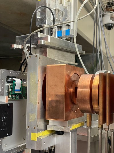 Der Protonenstrahl wird durch sogenannte Degrader (kupferfarben) abgeschwächt, um auf das richtige Energielevel gebracht zu werden. Anschließend wird er durch den rechteckigen Ausschnitt des sogenannten Collimators (Mitte) in die richtige Form gebracht und trifft schließlich auf die Testhardware.