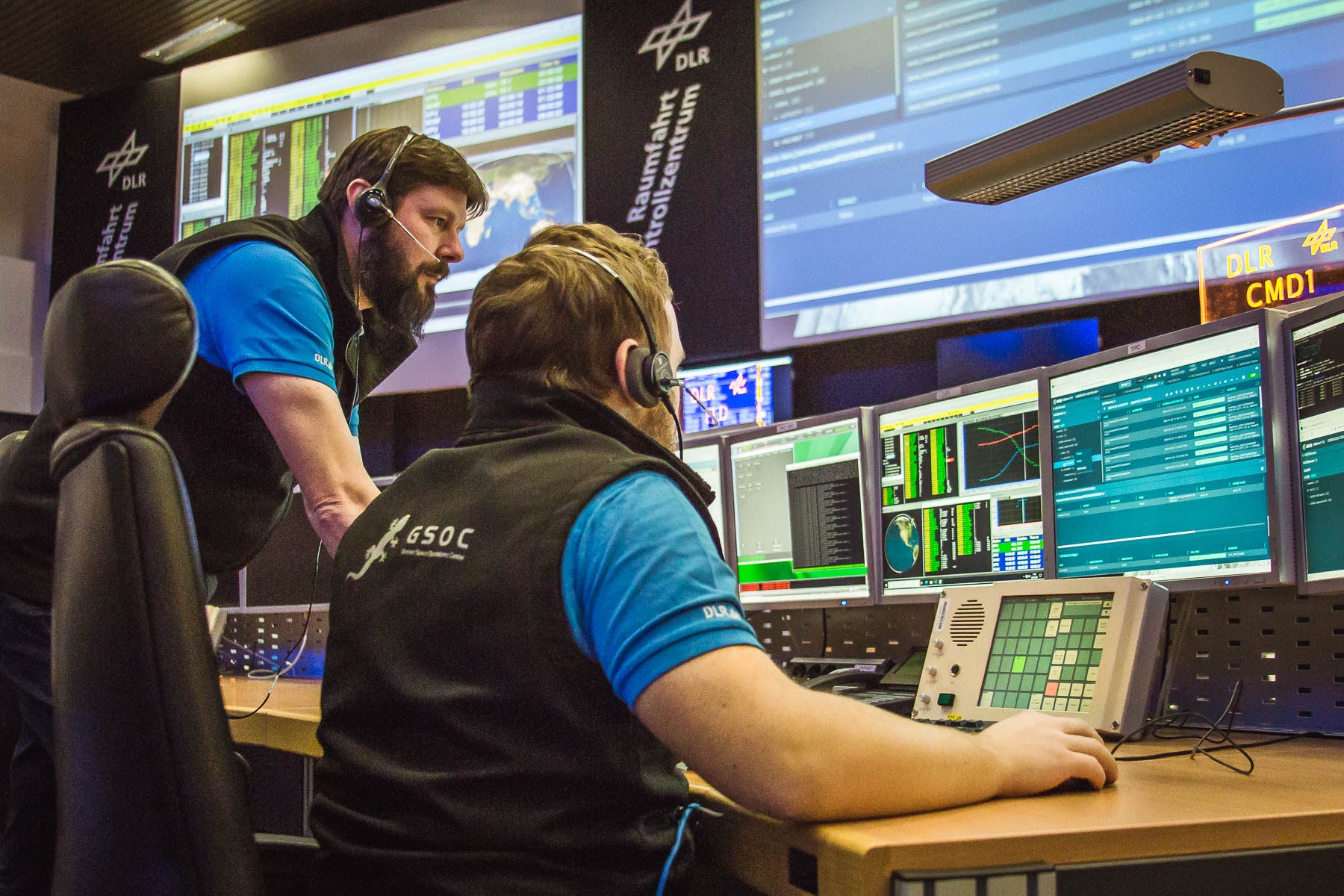 Ingenieure des Deutschen Raumfahrtkontrollzentrums bei der Kommandierung des DLR-eigenen Cubesats PIXL-I mit Hilfe des neuen europäischen Betriebssystem EGS-CC.