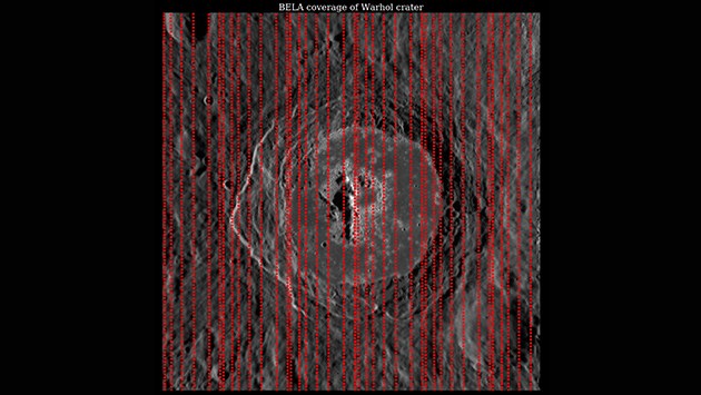Simulierte BELA-Bodenspuren am Beispiel des Kraters Warhol. Die Punkte geben den Auftreffpunkt einzelne Laser-Schüsse auf dem Boden wider. Im Krater sind die typischen terassenförmigen Strukturen und die Kraterebene mit dem Zentralberg gut zu erkennen. Rechts davon befinden sich sogenannte „Hollows“, Vertiefungen, die vermutlich nach Ausgasung flüchtiger Materialien als Hohlräume zurückbleiben. Das Bild zeigt einen Ausschnitt von 145 x 145 km.
