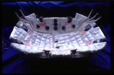 Die Anbindung der Nasenschale erfolgt über insgesamt 8 Einzelbeschläge, die jeweils ebenfalls aus Faserkeramik, bzw. im kühleren Bereich aus einer hochtemperaturbeständigen (bis ca. 1200°C) Metalllegierung (PM 1000 von Plansee, Österreich) hergestellt sind. Die spezielle Anordnung und Gestaltung des hebelartigen Befestigungssystems garantiert zum einen eine sehr gute mechanische Belastbarkeit, ermöglicht jedoch zum anderen auch eine unbehinderte Wärmeausdehnung der Struktur, die bei einem mittleren Durchmesser der Schale von 700 mm und dem erwarteten Temperaturniveau bis zu 3 mm betragen kann. Im Falle einer starren Befestigung würde die Schale nur durch die thermischen Zwangskräfte zerstört werden.