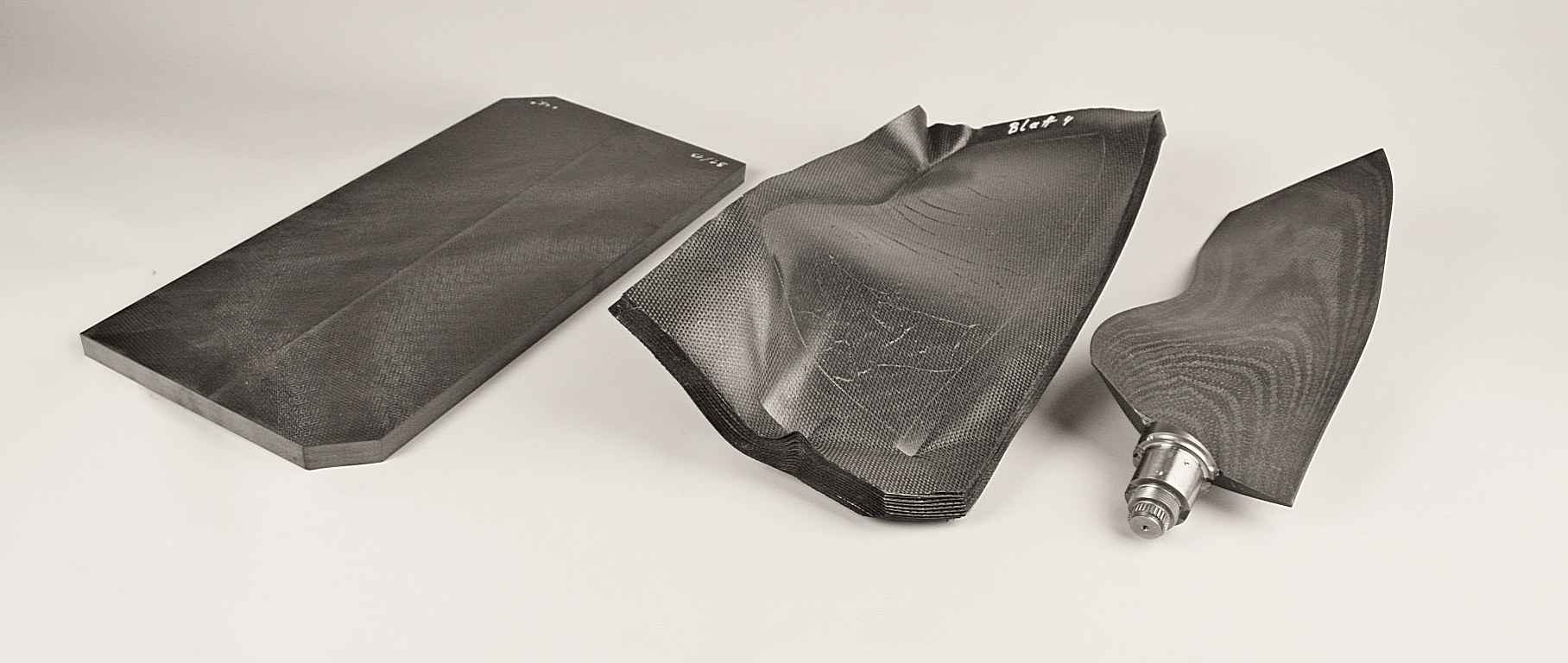 Fertigungsschritte eines thermoplastischen CFK Rotorblatts: Organoblech, umgeformter Rohling, finale Blattkontur nach Endbearbeitung