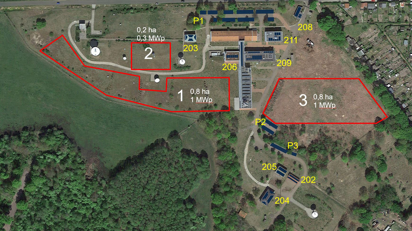 Um die elektrische Eigenversorgung zu maximieren und damit dem Ziel „Klimaneutralität bis 2035“ näher zu kommen, sollen an den DLR-Standorten an Gebäuden und auf Freiflächen Photovoltaikanlagen errichtet werden. Für den Standort Neustrelitz wurde in einer Potentialanalyse zum Beispiel ein Potential von rund 2.600 Kilowatt Peak (konservativ gerechnet 1.300 Kilowatt Peak) ermittelt. Den Unterschied bestimmen dann die tatsächlichen Rahmenbedingungen vor Ort.