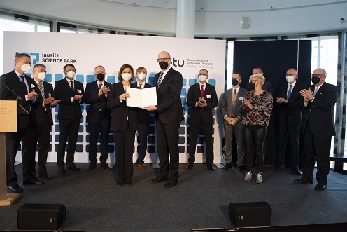 Diese vereint exzellente Grundlagen- und angewandte Forschung mit innovativen Ausgründungen und zahlreichen Unternehmensansiedlungen. Dafür hat sich die BTU gemeinsam mit dem Ministerium für Wissenschaft, Forschung und Kultur des Landes Brandenburg starke Partner*innen gesucht: die lokale Politik, außeruniversitäre Wissenschaftseinrichtungen wie die Fraunhofer-Gesellschaft, das Deutsche Zentrum für Luft- und Raumfahrt (DLR) und die Leibniz-Gemeinschaft sowie wirtschaftsstarke Unternehmen wie die LEAG, die BASF Schwarzheide, die Deutsche Bahn und Rolls-Royce. Gemeinsam haben sie heute während eines feierlichen Festaktes an der BTU eine Absichtserklärung zu Aufbau und Unterstützung des Lausitz Science Parks an Ministerpräsident Dr. Dietmar Woidke überreicht. Anwesend waren auch Brandenburgs Wissenschaftsministerin Dr. Manja Schüle und Wirtschaftsminister Prof. Dr.-Ing. Jörg Steinbach.