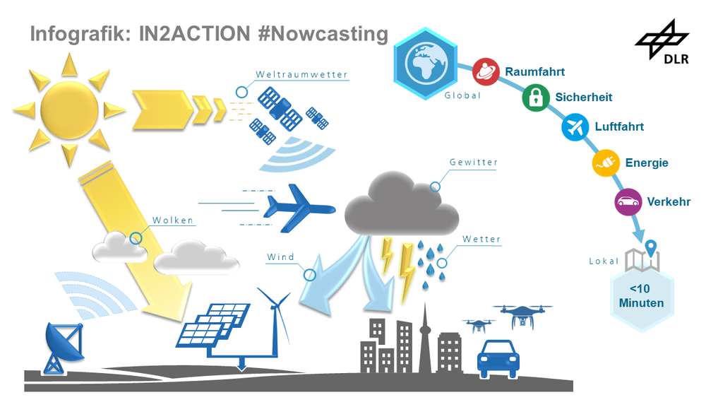 Im Projekt IN2ACTION (Insight, Information, Action) soll das physikalische Verständnis (Insight) von signifikantem Wetter und Weltraumwetter so aufbereitet werden, dass verwertbare und belastbare Kurzfristvorhersagen (Information) kleinskaliger Phänomene ermöglicht werden, die zu direkten Handlungsempfehlungen (Action) führen. Im DLR existieren verschiedene methodische Ketten zum Nowcasting signifikanter Wetter- und Weltraumwetterereignisse im Minuten- bis Stunden-Bereich. Eine neue Generation von Wettermodellen, Satellitendaten und die Entwicklungen der künstlichen Intelligenz versprechen ein großes Verbesserungspotential für Nowcastingsysteme und erlauben die Ableitung von Informationen mit bisher unerreichter Auflösung und Qualität. Im Projekt IN2ACTION werden moderne Nowcastingprodukte entwickelt und in den drei methodischen Strängen Weltraumwetter-, Wolken- und Gewitter/Wind-Nowcasting in betriebskritischen Situationen zum Einsatz gebracht. Hierfür werden fünf Demonstratoren in den programmatischen Themen Luftfahrt, Raumfahrt, Sicherheit, Energie und Verkehr aufgebaut, welche den Mehrwert der im DLR entwickelten Informationsketten für die Anwendung herausstellen.