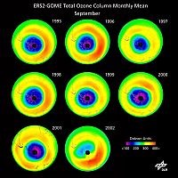 Seit 1995 werden am Deutschen Fernerkundungsdatenzentrum des DLR zur Beobachtung des Ozonlochs Messungen des Global Ozone Monitoring Experiments ausgewertet. Obwohl GOME an Bord des ESA Satelliten ERS-2 nur als Experiment konzipiert wurde, vermisst es seit 1995 kontinuierlich und erfolgreich die Ozonverteilung vom Weltall aus. Das Ozonloch ist die Folge anthropogener Produktion und Emission von FCKW's und den besonderen meteorologischen Bedingungen im Polarwirbel über der Antarktis. Im Winter sinken hier die Temperaturen in der Stratosphäre soweit ab, dass sich polare Stratosphärenwolken bilden können. In diesen Wolken werden Teile der FCKW´s angelagert und umgewandelt. Mit Ende der Polarnacht werden diese Verbindungen zu so genannten Radikalen aktiviert und führen zur massiven Ozonzerstörung.