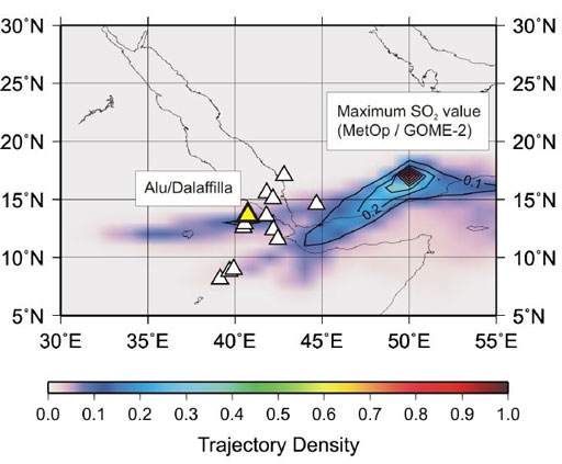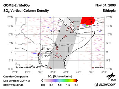 Am 4. November 2008 registrierte der Atmosphärensensor GOME-2 (Global Ozone Monitoring Experiment) eine große Schwefeldioxidfahne über dem Jemen mit SO2-Konzentrationen von mehr als 40 Dobson Units, was auf einen Vulkanausbruch hinweist. Bislang wurden weder Bodenmessungen noch Augenzeugen des Vulkanausbruchs gemeldet. Mittels Rückwärtstrajektorien-Analyse berechneten Wissenschaftler des DFD eine Trajektoriendichtekarte, welche die Ableitung weiterer Informationen über die Eruptionsquelle und –charakteristik erlaubt. Danach erfolgte der Ausbruch nahe dem Erta Ale Vulkan in der Wüste von Danakil in Äthiopien. An der Nordflanke des Erta Ale befinden sich die beiden kleinen Vulkane Alu and Dalaffilla, welche mit hoher Wahrscheinlichkeit die Eruptionsquellen sind.