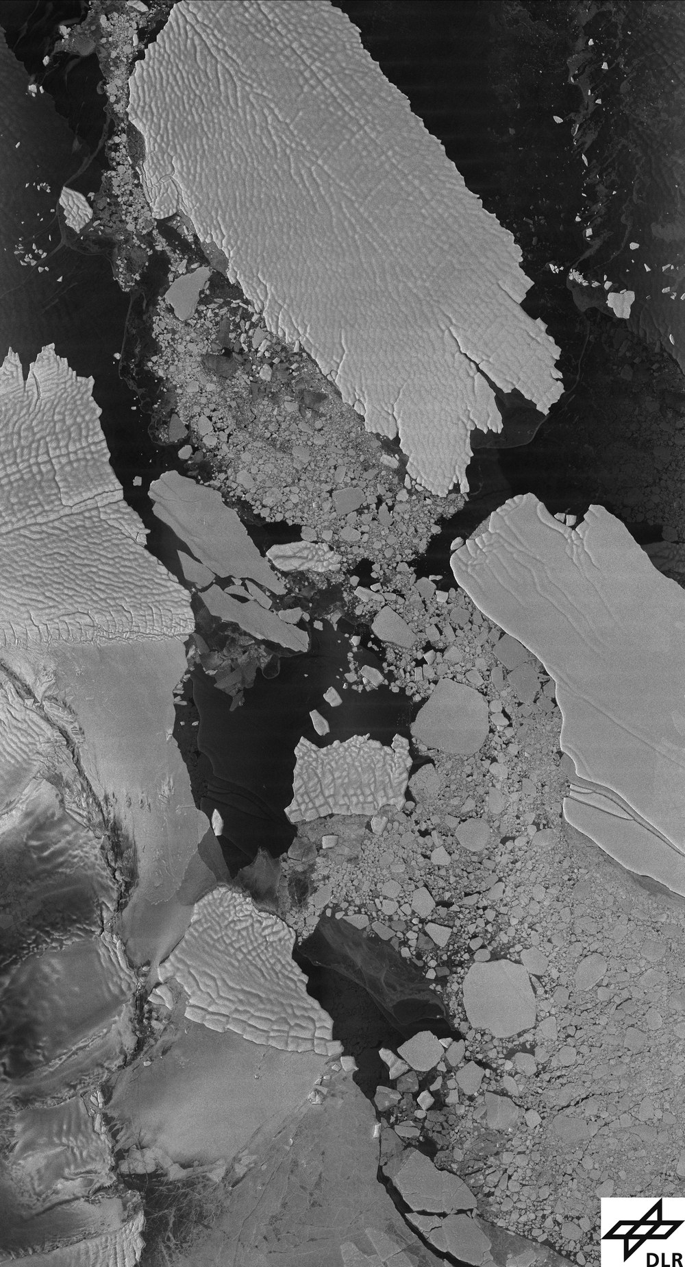 Eine 400 Meter hohe Gletscherzunge der Größe Luxemburgs wurde aus dem Mertz-Gletscher in der australischen Antarktis herausgebrochen, nachdem dieser am 26. Februar durch den ca. 97 km langen Eisberg B-09B gerammt wurde. Hochauflösende Daten des deutschen Radarsatelliten TerraSAR-X zeigen die aktuelle Situation im Detail.