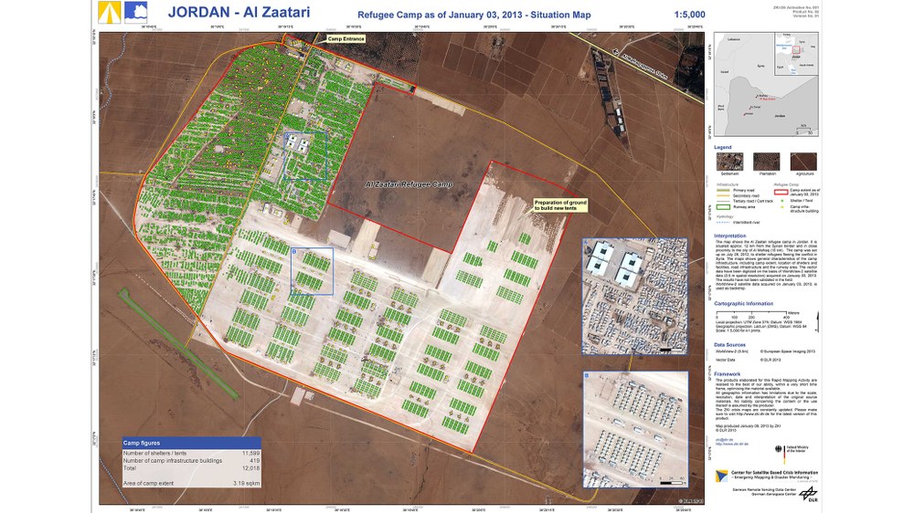 Die erste Anfrage im Rahmen des Kooperationsvertrags hat das ZKI bereits umgesetzt: Aufgrund der anhaltenden Konflikte in Syrien, sind im jordanischen Flüchtlingslager Al Zaatari bereits über 40.000 Flüchtlinge angekommen und täglich werden es mehr. Starke Regenfälle führten Anfang Januar zu Überflutungen und Zerstörungen im Camp. Zur genauen Situationserfassung erstellte das ZKI, im Auftrag des Technischen Hilfswerks, umgehend Schadensanalysen und Satellitenbildkarten – für eine optimale Koordinierung der Notfalleinsatzkräfte.