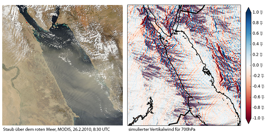 Die Aufnahme des Terra-MODIS zeigt eindrucksvoll, wie der Wüstenstaub die charakteristische Rippenstruktur eines Schwerewellenfeldes über dem Roten Meer sichtbar macht. Das Schwerewellenfeld wurde dabei maßgeblich durch Orographie und den Land-See-Übergang ausgelöst.