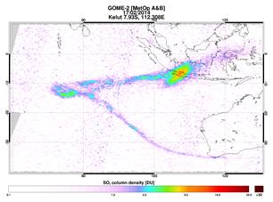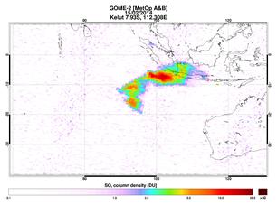 Am Abend des 13. Februar 2014 gegen 22:50 Uhr Ortszeit ist der Vulkan Kelut ausgebrochen. Das EOC misst in Nahe-Echtzeit die emittierten Spurengase und deren Verteilung. Dem Ausbruch war in den letzten Wochen erhöhte seismische Aktivität vorangegangen.