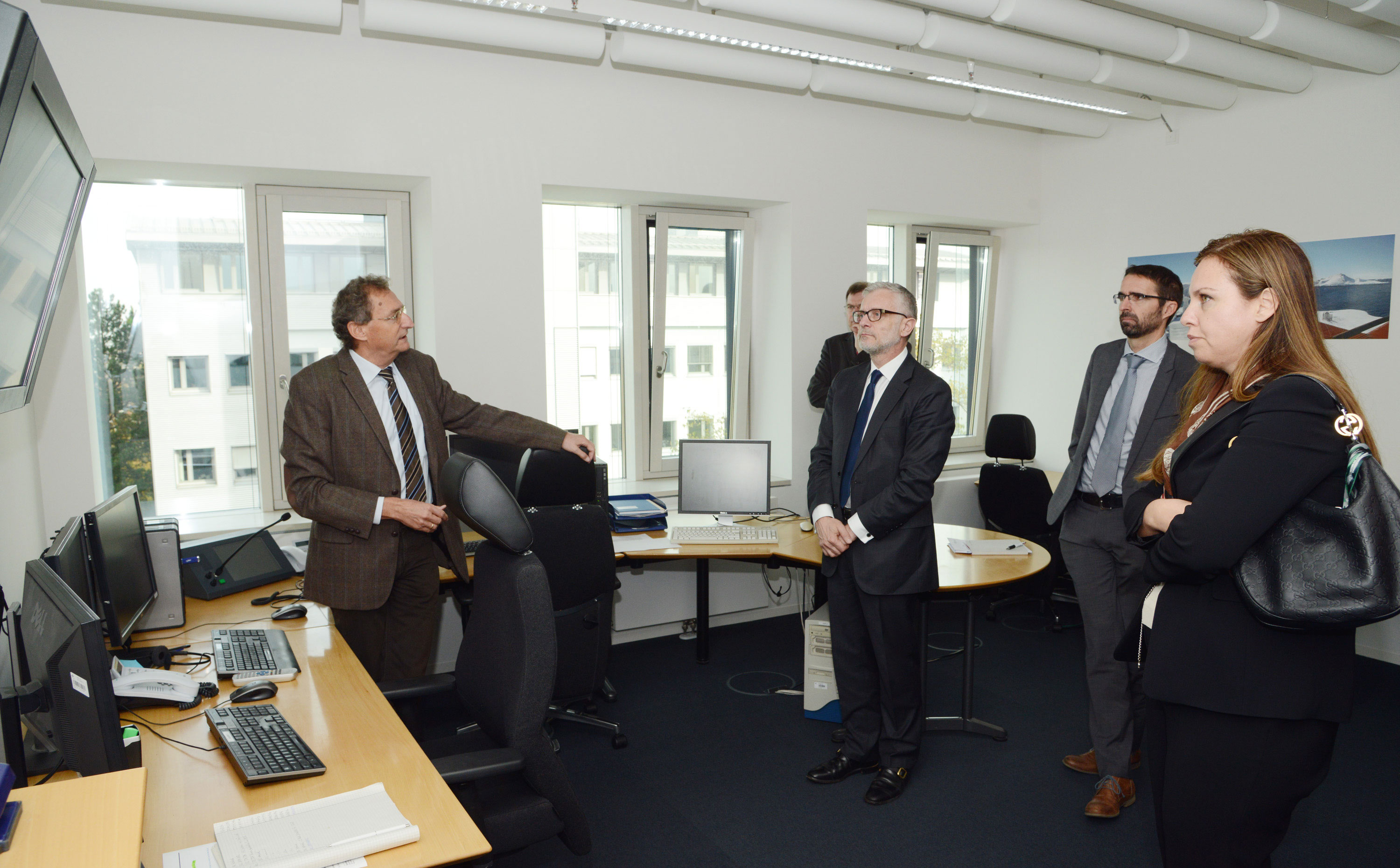 Philippe Brunet, Direktor in der Generaldirektion Unternehmen und Industrie und verantwortlich für die europäischen Weltraumprojekte Copernicus und Galileo, besuchte zusammen mit einer Delegation der Europäischen Kommission am 12.11.2014 das EOC in Oberpfaffenhofen.