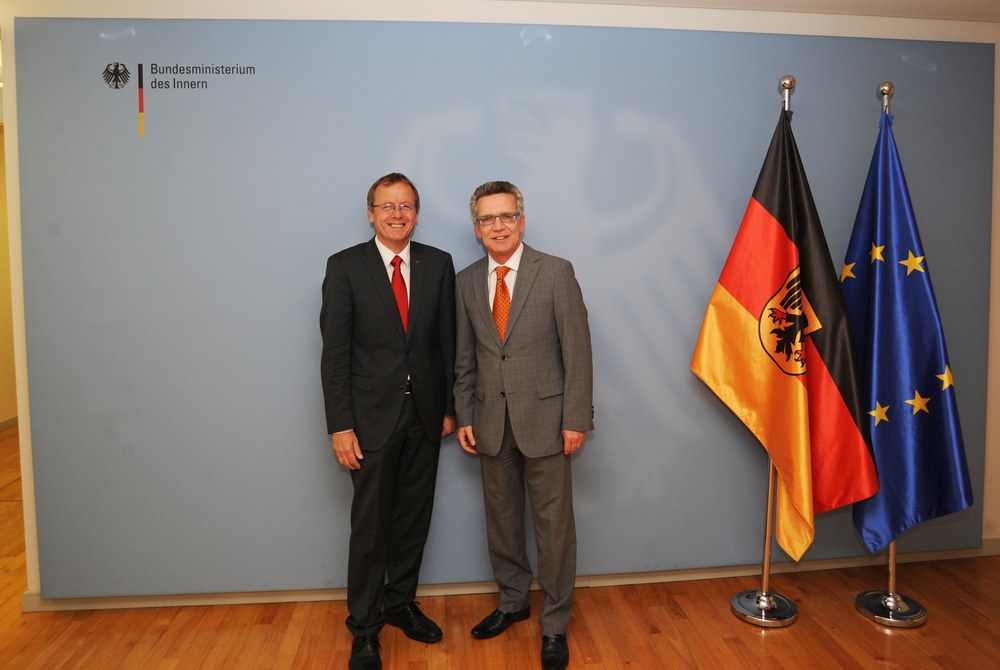Bundesinnenminister Dr. Thomas de Maizière und der DLR Vorstandsvorsitzende Prof. Dr. Johann-Dietrich Wörner haben sich aktuell über die Nutzung von Fernerkundungsdaten in Krisenfällen und zur Unterstützung der zivilen und polizeilichen Sicherheit ausgetauscht.