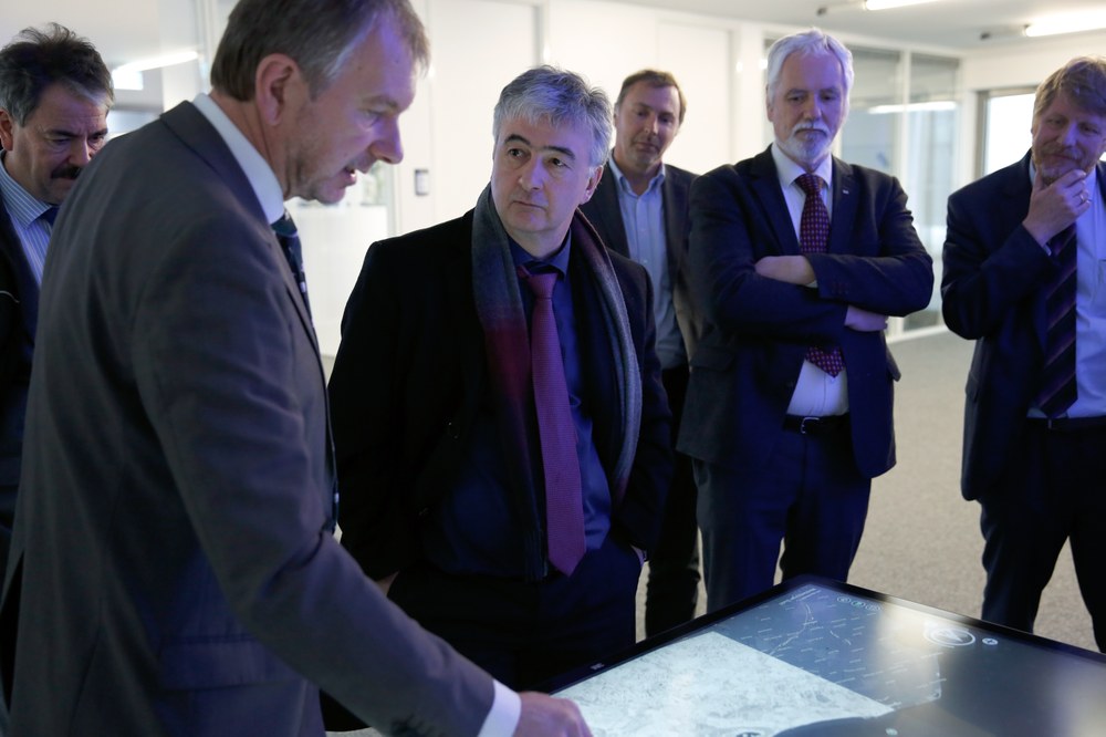 Bereits am 09. Januar begrüßte das EOC wieder den ersten Besucher aus der Bundespolitik. Dr. Wolfgang Scheremet, Leiter der Abteilung IV am Bundeswirtschaftsministerium, ist für das Thema Industriepolitik, sowie den Themenbereich der Luft- und Raumfahrt verantwortlich. Der Vorstandsvorsitzende des DLR, Prof. Wörner, empfing den Gast aus Bonn persönlich in Oberpfaffenhofen. Herr Scheremet ließ sich über die Arbeiten des EOC informieren und besichtigte die Kontrollräume für die Antennensteuerung sowie das Zentrum für satellitengestützte Kriseninformation (ZKI). Von besonderem Interesse waren die Arbeiten von IMF und DFD im Bereich der maritimen Sicherheit sowie die informationstechnischen Herausforderungen durch das europäische Copernicus-Programm. Begleitet wurde Herr Dr. Scheremet von Herrn Ministerialrat Rüdiger Wolf und Herrn Wolfgang Schneider vom BMWi.