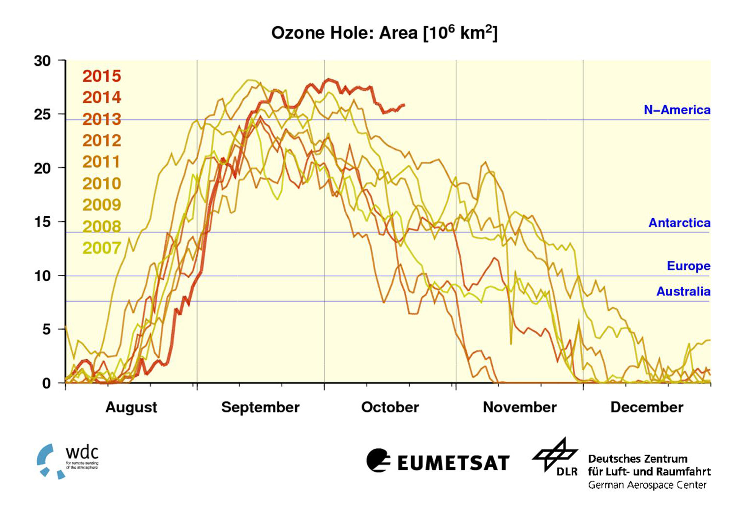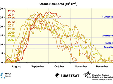 Das Ozonloch über der Antarktis erstreckt sich derzeit über 26 Millionen Quadratkilometer, eine Fläche, größer als der nordamerikanische Kontinent. Aktuell ist es um ca. 2,5 Mio. Quadratkilometer größer als zum selben Zeitpunkt im Jahr 2014. Nur im Jahr 2006 war es mit 27 Millionen Quadratkilometern noch größer. Mit Hilfe von Satelliten haben Wissenschaftler des Erdbeobachtungszentrums (EOC) am Deutschen Zentrum für Luft- und Raumfahrt (DLR) diese Entwicklung dokumentiert. Sie beobachten permanent die schützende Ozonschicht und analysieren die Veränderungen.