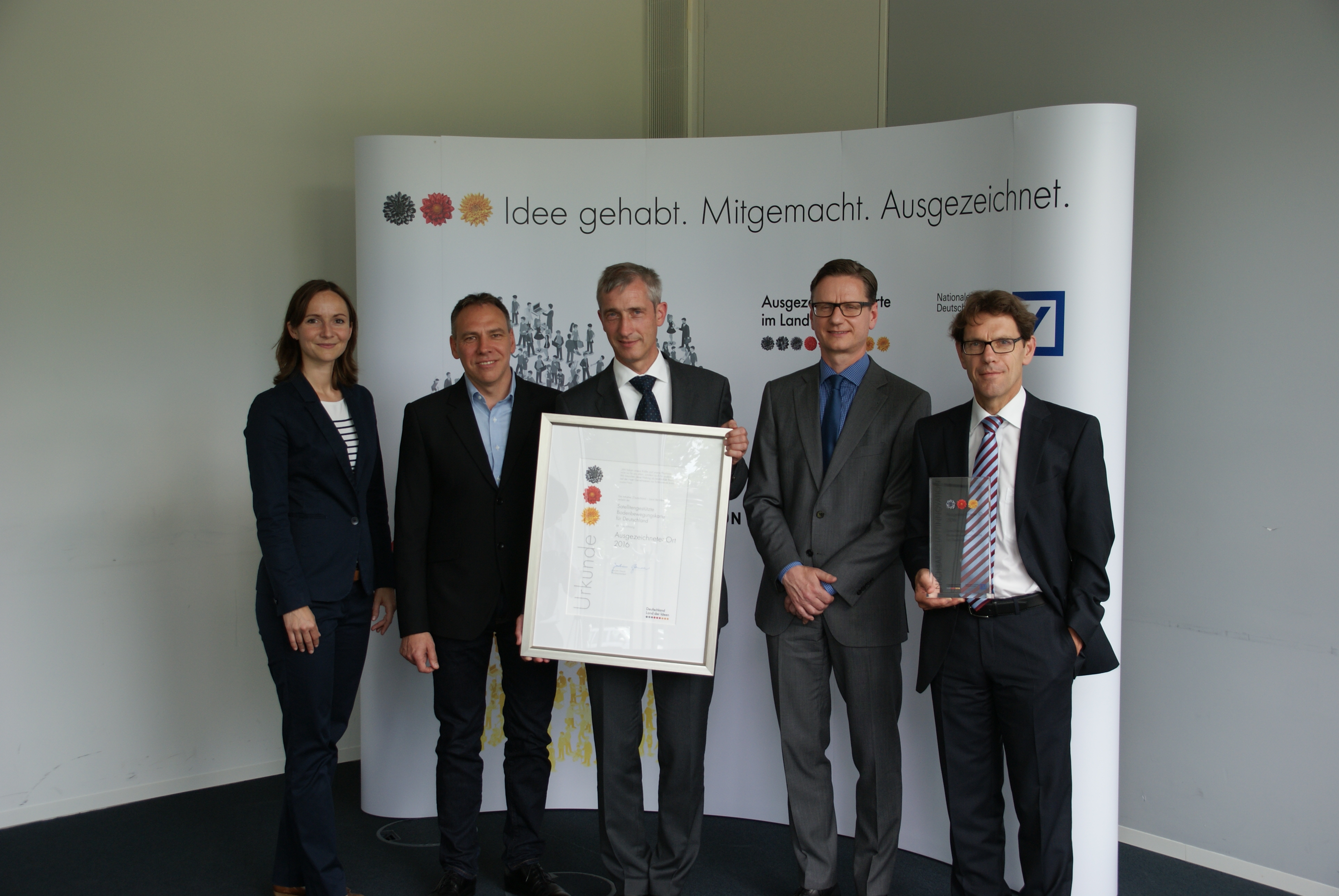 Die satellitengestützte Erfassung von Bodenbewegungen im Millimeterbereich ist sowohl für die Sicherheit von Infrastruktur und Gebäuden, als auch für die frühe Erkennung von Georisiken (Erdrutsche, Erdbeben, etc.) von großer Bedeutung. Deshalb arbeiten Wissenschaftler des Deutschen Zentrums für Luft- und Raumfahrt (DLR), der TU München (TUM) und der Bundesanstalt für Geowissenschaften und Rohstoffe (BGR) zurzeit eng zusammen, um eine „Satellitengestützten Bodenbewegungskarte für Deutschland“ zu entwickeln. Mit dieser innovativen Idee wurde das IMF nun im Rahmen des Wettbewerbs „Ausgezeichnete Orte im Land der Ideen“ zu einem der 100 „Ausgezeichneten Orte 2016“ ernannt.