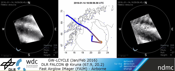 Im Rahmen der jetzt abgeschlossenen Messkampagne im Projekt GW-LCYCLE konnten Wissenschaftler des EOC erstmals vom Flugzeug aus atmosphärische Schwerewellen in einer Höhe von etwa 87 Kilometern aufnehmen. Die Infrarotkamera FAIM-02 hat an Bord des DLR-Forschungsflugzeugs „Falcon“ die Emissionsstrahlung von rotations-/vibrationsangeregten Hydroxyl (OH)-Molekülen aus der sogenannten Airglow-Schicht der Atmosphäre horizontal und zeitlich hoch aufgelöst erfasst und den Einfluss der Schwerewellen dort sichtbar gemacht. Zeitgleich wurden von Kiruna (Schweden) und von Andenes/ALOMAR (Norwegen) aus bodengebundene Messungen mit zwei Infrarot-Spektrometern (GRIPS-9 und GRIPS-14) sowie der Infrarot-Kamera FAIM-03 durchgeführt.