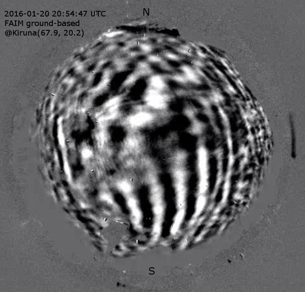 Ergänzt wurde die Datenbasis durch bodengebundene Aufnahmen eines ähnlichen Kamerasystems, mit einem Fischaugen-Objektiv, das den gesamten Nachthimmel betrachtet (siehe Abbildung 3, Sichtfeld angedeutet durch den Kreis auf der Karte in Abbildung 2) sowie zweier GRIPS - Infrarotspektrometer (GRound based P-branch Infrared Spectrometer) in Kiruna, Nordschweden bzw. ALOMAR, Nordnorwegen (siehe Karte in Abbildung 2). Die Infrarotspektrometer steuern an den entsprechenden Stationen Temperaturverläufe im Bereich der Mesopause bei.