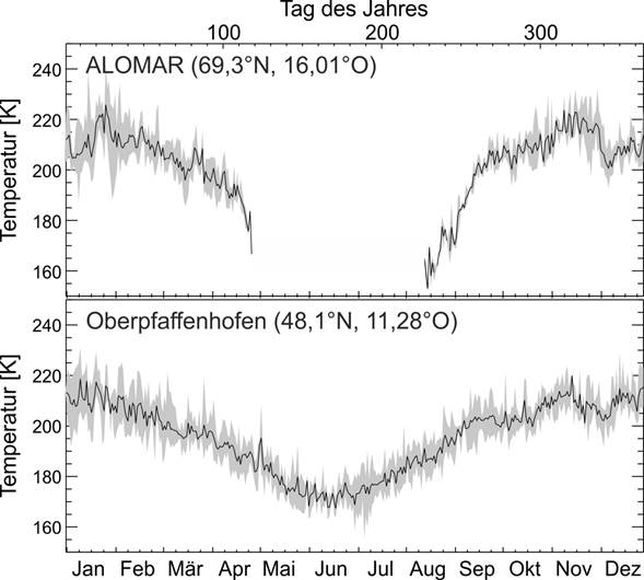 Der Einfluss von Schwerewellen auf die Atmosphäre ist z.B. unmittelbar an der Temperaturverteilung in der Mesopause zu erkennen. Die Mesopause liegt in einer Höhe von etwa 87 km. Intuitiv erwartet man auch über dem Winterpol in dieser Höhe kältere Temperaturen als über dem Sommerpol, da letzterer wie die Erdoberfläche durch die permanente Sonneneinstrahlung den ganzen Tag „geheizt“ wird. In Wirklichkeit ist eine genau entgegengesetzte Temperaturverteilung zu beobachten: der Sommerpol ist in der Mesopause kälter als der Winterpol (siehe Abbildung 1). Dieser Effekt ist maßgeblich auf brechende Schwerewellen und deren Einfluss auf die großskalige Zirkulation zurückzuführen. Es zeigt sich: Dynamische Vorgänge können die Atmosphäre in diesem Höhenbereich durchaus weit vom Zustand des reinen Strahlungsgleichgewichts entfernen.