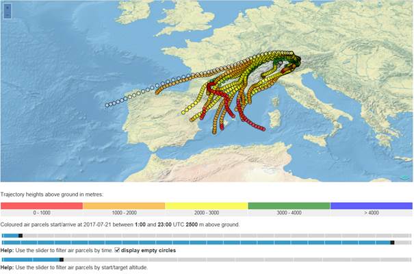 Mit wenigen „Klicks“ können nun komplexe Trajektorienberechnungen online durchgeführt werden. Nach kurzer Rechenzeit werden für den gewünschten Ort und Zeitpunkt die Zugbahnen der dort ankommenden Luftpakete angezeigt. Über einen Schieber kann der gewünschte Zeitraum weiter feinjustiert werden. Für die Berechnung kommen die Codes FLEXTRA und FLEXPART (Autoren: A. Stohl et al., siehe Link FLEXPART) zum Einsatz. Das Werkzeug ist nur eines von vielen, die im Rahmen des Virtuellen Alpenobservatoriums (VAO) für das „Alpine Environmental Data Analysis Center, AlpEnDAC“ entstehen. Das DFD ist maßgeblich an der Entwicklung des AlpEnDAC beteiligt. Weitere Partner sind das Leibniz Rechenzentrum (LRZ), die UFS GmbH, die bifa GmbH sowie das Institut für Physik der Universität Augsburg, das die Projektleitung innehat. AlpEnDAC ermöglicht es Wissenschaftlern (auch ohne Erfahrung im Simulationsbereich), komplexe numerische Simulationen über eine einfach zu bedienende Oberfläche auszuführen („computing-on-demand“).